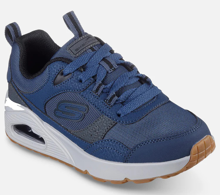 A Skechers Uno Retro Groove (403659L) egy divatos, fűzős fiú sportcipő, amely a klasszikus "court" stílust hozza el modern kényelmi funkciókkal, többek között légpárnás középtalppal és Memory Foam® talpbetéttel.