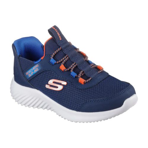 A Skechers Hands Free Slip-ins®: Bounder - Brisk-Burst (403822L) egy modern gyerek sportcipő, amelynek fő különlegessége a TOUCHLESS FIT® technológia, így a gyerekek kéz használata nélkül, egyszerűen belelépve tudják felvenni.
